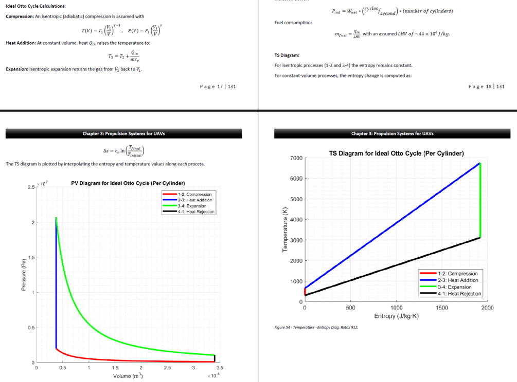 - Ready-to-Run MATLAB Scripts: Simulate Otto-cycle PV & TS diagrams, electric-UAV endurance models, and BLDC motor–ESC–propeller thrust calculations with fully commented code.